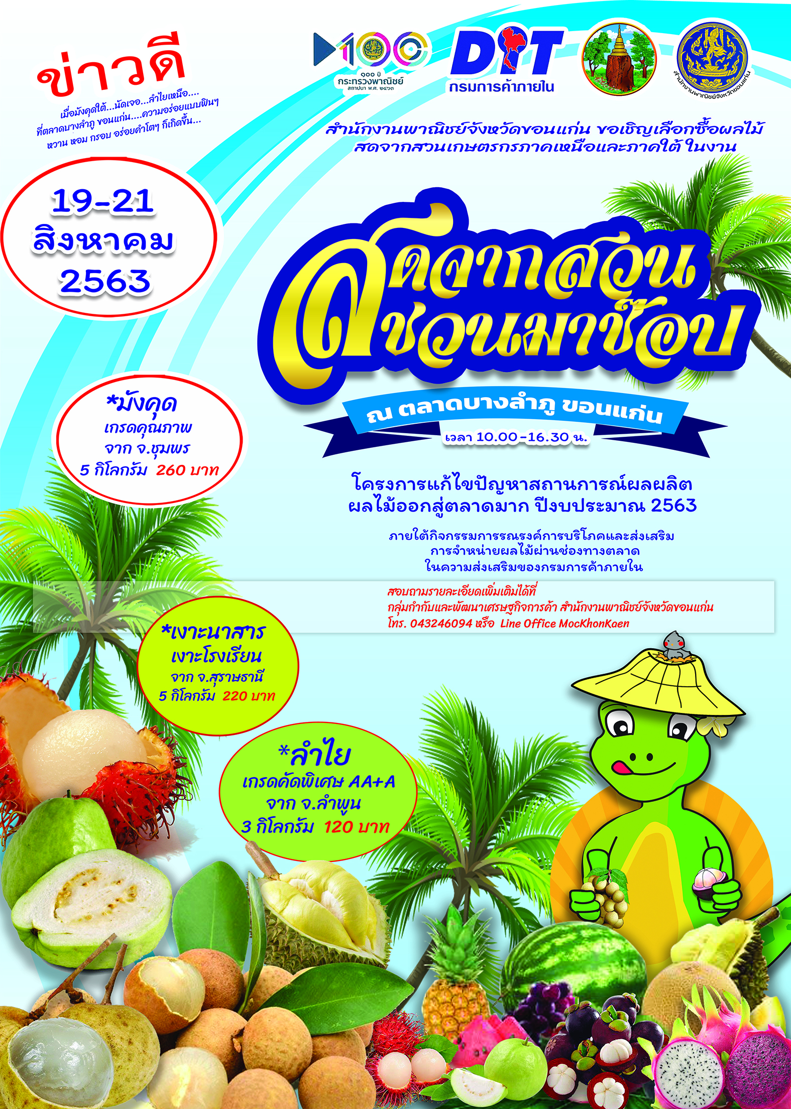 พาณิชย์ขอนแก่น นำผลไม้สดจากสวนมาจัดจำหน่ายในงาน "สดจากสวน ชวนมาช๊อป" ภายใต้กิจกรรมการรณรงค์การบริโภคและส่งเสริมการจำหน่ายผลไม้ในตลาดสด ระหว่างวันที่ 19-21 สิงหาคม 2563