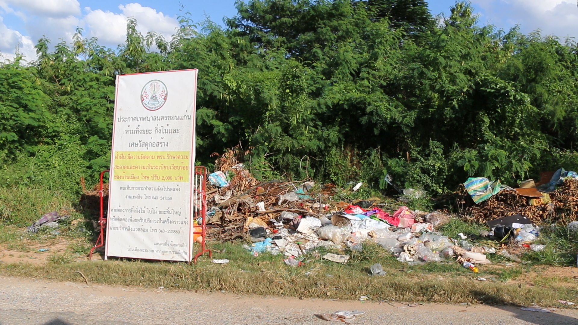 เมื่อเวลา 09.00 น. วันที่ 18 พ.ย.2563 ผู้สื่อข่าวลงพื้นที่ศูนย์ปฏิบัติธรรมหลวงปู่โพธิ์บ้านโนนทัน 9-7 ในเขตเทศบาลนครขอนแก่น พระสุชาติ สุชาโต พระลูกวัด ศูนย์ปฏิบัติธรรมหลวงปู่โพธิ์ พร้อมด้วย น.ส.มะลิวัลย์ เรื่องจรัส ประธานชุมชนโนนทัน 9 และชาวบ้านชุมชน พาผู้สื่อข่าวสำรวจบริเวณริมถนนด้านหลังศูนย์ปฏิบัติธรรมฯ ซึ่งมีกองขยะขนาดใหญ่หลายกอง ทิ้งอยู่ด้านหลังป้ายห้ามทิ้งขยะของทางเทศบาลนครขอนแก่น โดยมีข้อความระบุว่า “ห้ามทิ้งขยะ กิ่งไม้และเศษวัสดุก่อสร้าง ฝ่าฝืน มีความผิดตามพรบ.รักษาความสะอาด และความเป็นระเบียบเรียบร้อยของบ้านเมือง โทษปรับ 2,000 บาท พบเห็นการกระทำความผิดโปรดแจ้ง งานเทศกิจ โทร 043 -247158 หากต้องการทิ้งกิ่งไม้ ใบไม้ ขยะชิ้นใหญ่ หรือติดต่อ เพื่อขอรับบริการเป็นคราวแจ้ง ฝ่ายบริการสิ่งแวดล้อมโทร 043- 23880 หนึ่งแสน คนทิ้ง 100 คนเก็บบ้านเมืองสะอาดหากทุกท่านร่วมมือกัน” ซึ่งถนนเส้นดังกล่าวนี้มีระยะทางประมาณ 400 เมตรก่อนจะเลี้ยวขวาไปถึงบ่อขยะ มีรถของชาวบ้านสัญจรผ่านไปมาตลอด และมีขยะกองริมถนนหลายกองตลอดแนว