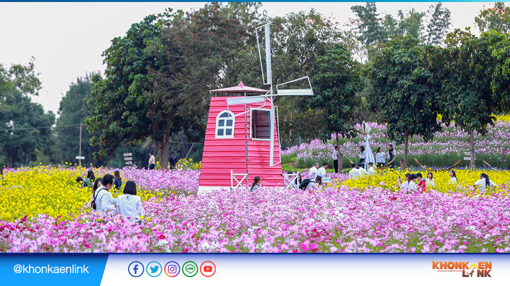 นักท่องเที่ยวแห่ชมแปลงกังหันทุ่งดอกไม้นานาพรรณ ภายใน ม.ขอนแก่น รับวันหยุดยาว ชมความสวยงาม ทุ่งคอสมอส, บลูซัลเวีย, ดอกเสี้ยน และดอกไม้นานาพรรณนับแสนต้น ที่เบ่งบานชูช่อ 1 ปี มี 1 ครั้ง เท่านั้น