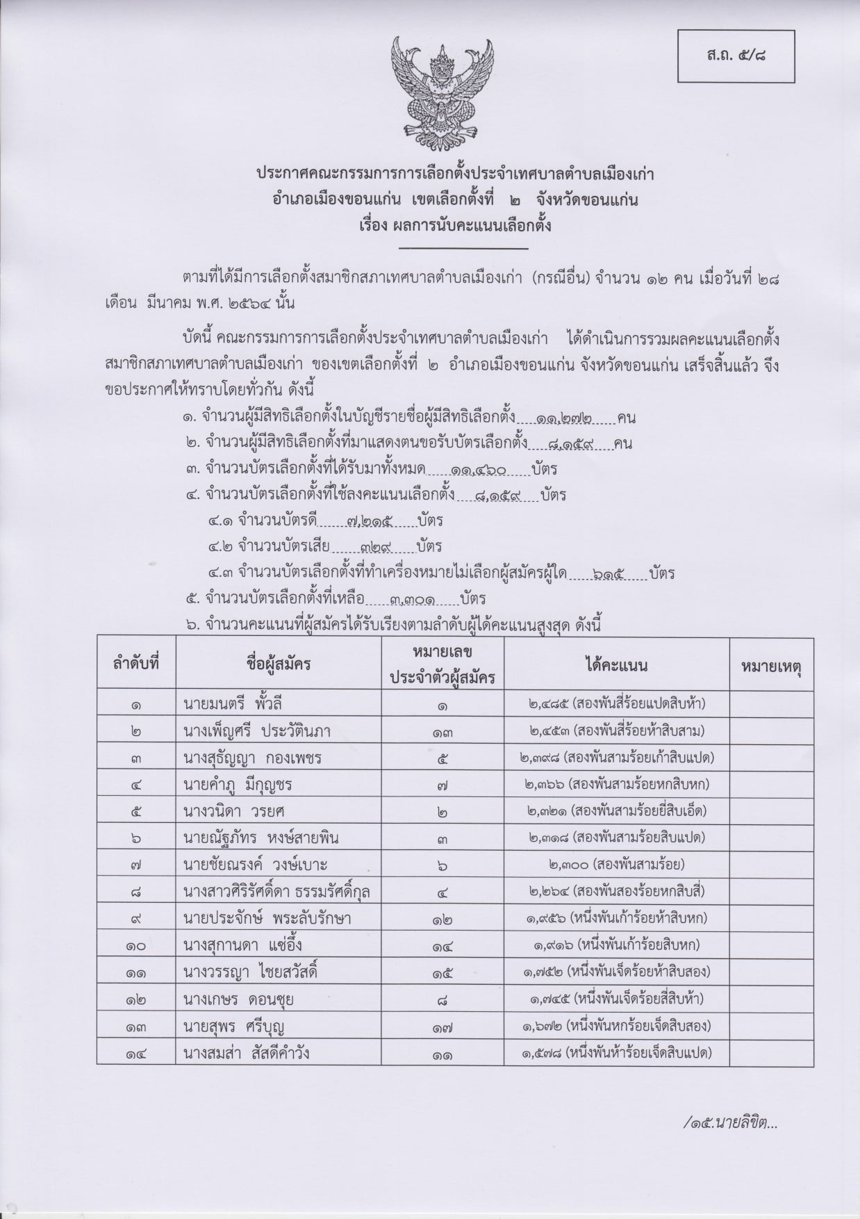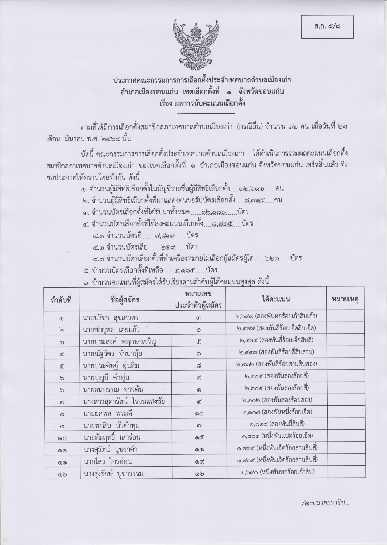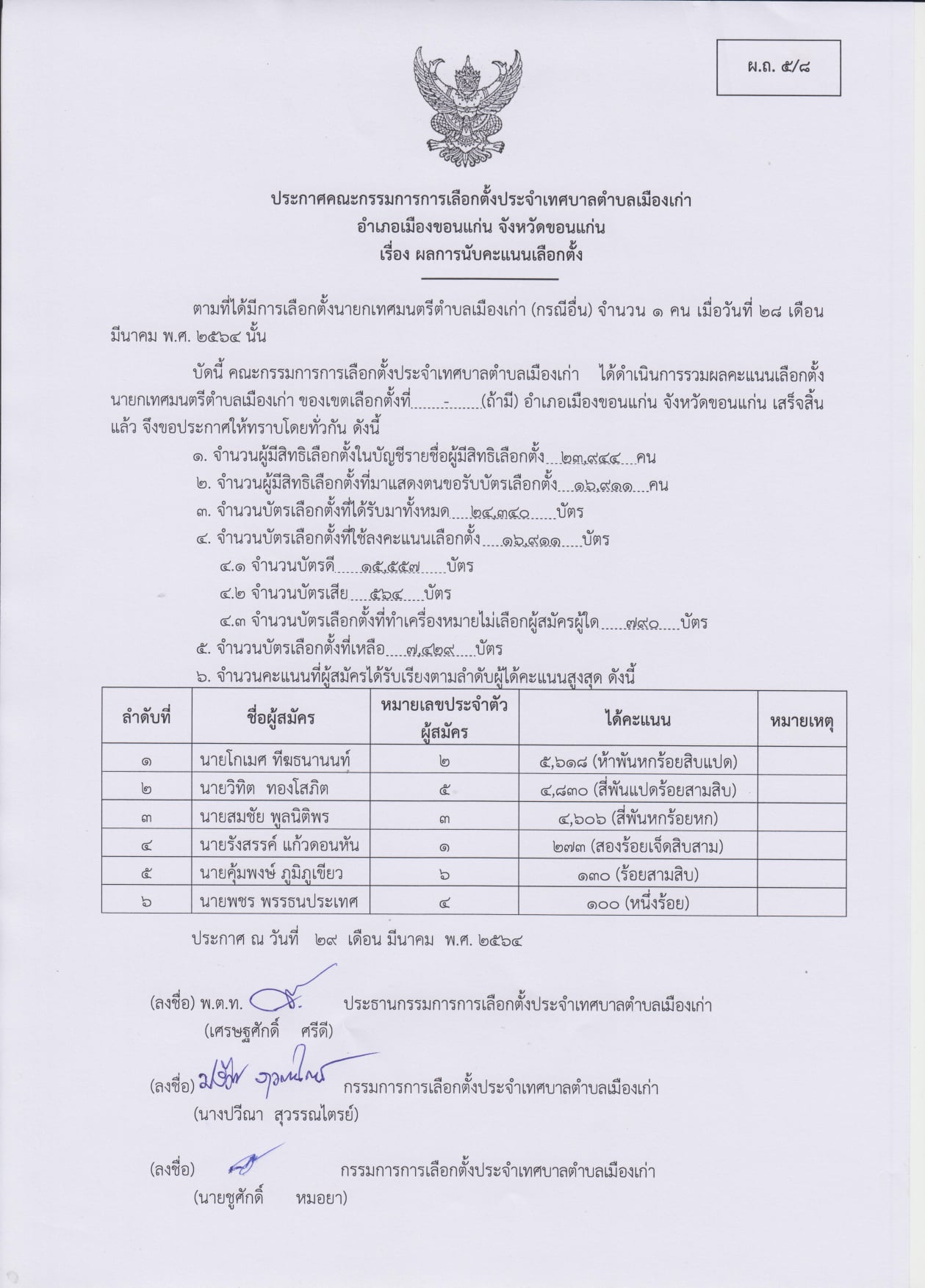 อันดับ 1 นายโกเมศ ทีฆธนานนท์ หมายเลข 2 ได้ 5,618 คะแนน เป็นนายกเทศมนตรีตำบลเมืองเก่า