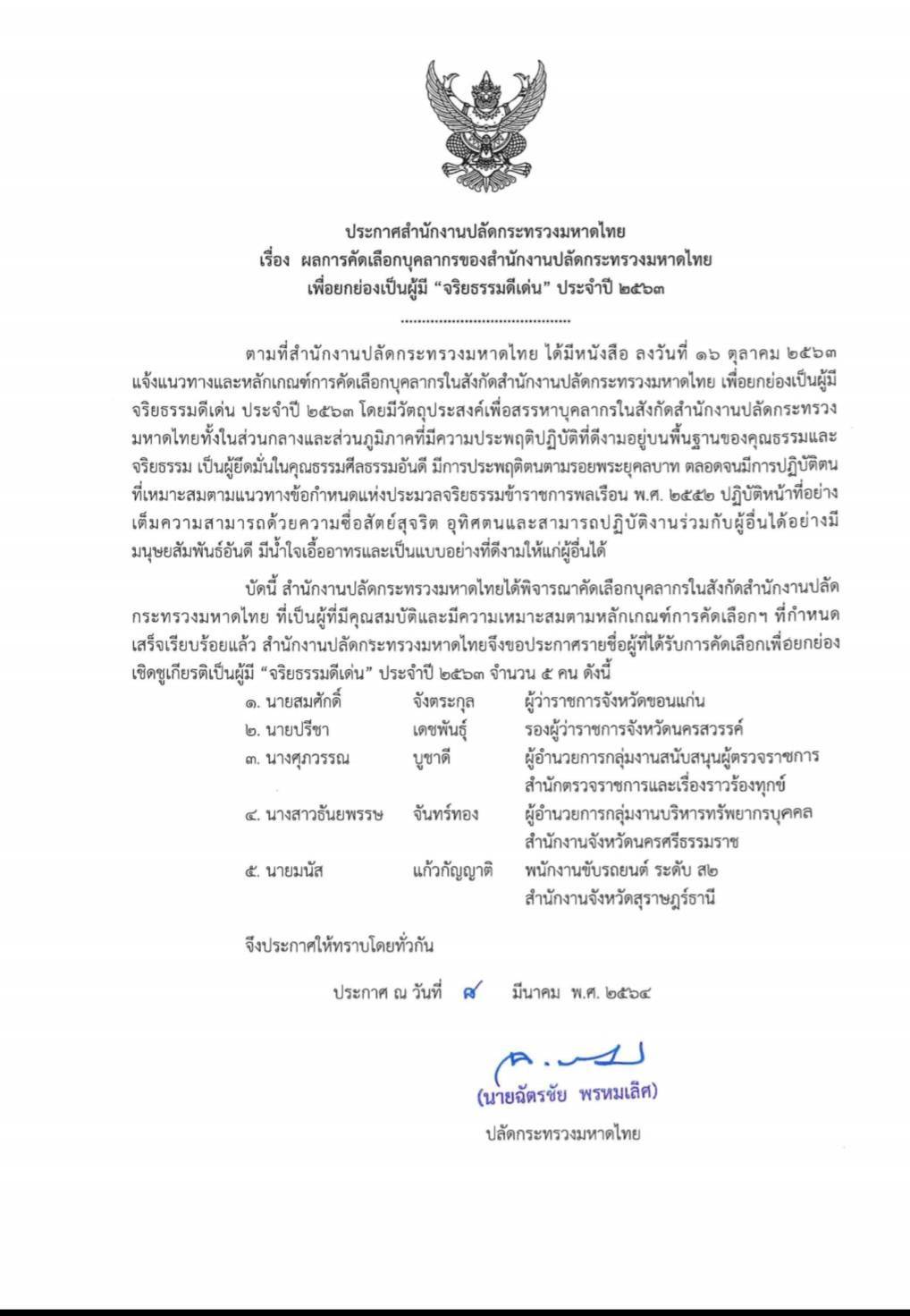 ตามที่สำนักงานปลัดกระทรวงมหาดไทย ได้มีหนังสือ ลงวันที่ ๑๖ ตุลาคม ๒๕๖๓ โดยมีวัตถุประสงค์เพื่อสรรหาบุคลากรในสังกัดสำนักงานปลัดกระทรวงมหาดไทยทั้งในส่วนกลางและส่วนภูมิภาคที่มีความประพฤติปฏิบัติที่ดีงาม อยู่บนพื้นฐานของคุณธรรมและจริยธรรม เป็นผู้ยืดมั่นในคุณธรรมศีลธรรมอันดี มีการประพฤติตนตามรอยพระยุคลบาท ตลอดจนมีการปฏิบัติที่เหมาะสมตามแนวทางข้อกำหนดแห่งประมวลจริยธรรมช้ำราชการพลเรือน พ.ศ. ๒๕๕๒ ปฏิบัติหน้าที่อย่างเต็มความสามารถด้วยความซื่อสัตย์สุจริต อุทิศตนและสามารถปฏิบัติงานร่วมกับผู้อื่นได้อย่างมีมนุษยสัมพันธ์อันดี มีน้ำใจเอื้ออาทรและเป็นแบบอย่างที่ดี จำนวน ๕ คน ดังนี้