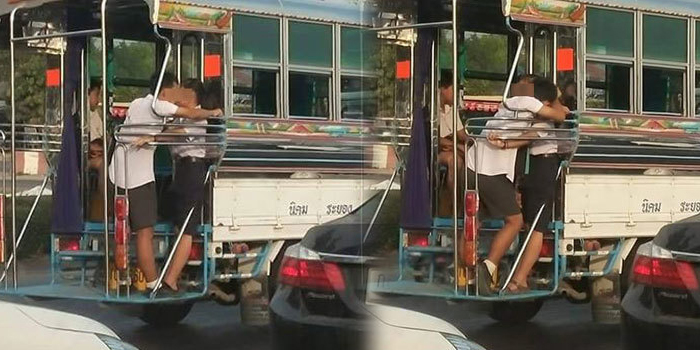 แชร์ว่อน ภาพคู่รักนักเรียน ยืนนัวเนียท้ายรถสองแถว