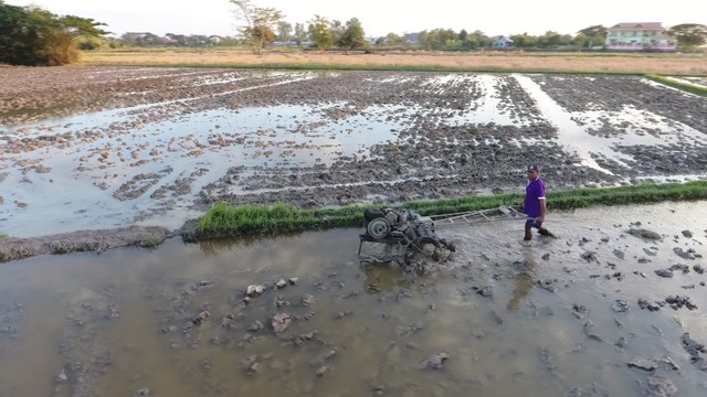 นอกจากนี้ตนเองยังได้ใช้รถไถนาไถปรับพื้นที่นาข้างเอง แทนการจ้างรถไถนาที่มีค่าจ้างสูงกว่าไร่ละ 650 บาท จากการใช้รถไถนาเดินตามที่มีอยู่ ทำให้การทำข้าวนาปรังปีนี้มีต้นทุนต่ำไม่ต้องไปเสียเงิน ค่าจ้างรถไถนา เมื่อเก็บเกี่ยวผลผลิตแม้จะมีราคาข้าวตกต่ำ แต่ต้นทุนการทำนาที่ต่ำ ก็ยังสามารถเหลือเงินเก็บสำหรับการทำข้าวนาปีได้ ขอให้เกษตรกรที่จะทำนาปรังลองหันมาทำแบบตนเอง เพื่อลดต้นทุนในการผลิตจะได้มีเงินเหลือ