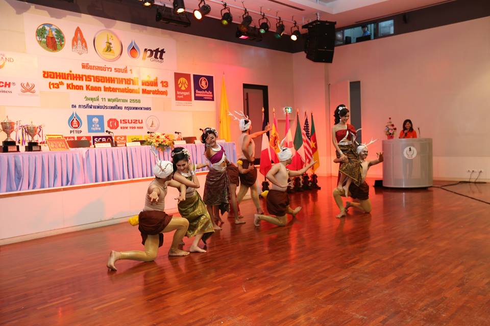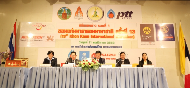 เมื่อวันพุธที่ 11 พฤศจิกายน 2558 เวลา 13.30 น. – 15.30 น. มหาวิทยาลัยขอนแก่น จัดพิธีแถลงข่าวการแข่งขัน “ขอนแก่นมาราธอนนานาชาติ ครั้งที่ 13” โดยมีนายกำธร ถาวรสถิตย์ ผู้ว่าราชการจังหวัดขอนแก่น พร้อมด้วย รศ.ดร.เพียรศักดิ์ ภักดี รองอธิการบดีฝ่ายพัฒนานักศึกษาและศิษย์เก่าสัมพันธ์ มหาวิทยาลัยขอนแก่น และผู้สนับสนุนหลัก ประกอบด้วย คุณปรียานุช เอกณรงค์ ผู้จัดการฝ่ายกิจการเพื่อสังคม บริษัท การปิโตรเลียมแห่งประเทศไทย จำกัด (มหาชน) คุณอภิชัย ฉัตรเฉลิมกิจ ผู้อำนวยการกองส่งเสริมกิจกรรม การท่องเที่ยวแห่งประเทศไทย คุณวรรณิภา รุ่งเรือง ผู้อำนวยการอาวุโส ฝ่ายกิจกรรมการตลาด ธนาคารกรุงศรีอยุธยา จำกัด (มหาชน) ผู้แทน ธนาคารกรุงไทย จำกัด (มหาชน) และผู้แทน บริษัทโค้วยู่ฮะมอเตอร์ จำกัด สาขาขอนแก่น ร่วมแถลงข่าว ณ ห้องประชุมชั้น 24 อาคารเฉลิมพระเกียรติ 7 รอบ พระชนมพรรษา การกีฬาแห่งประเทศไทย กรุงเทพมหานคร