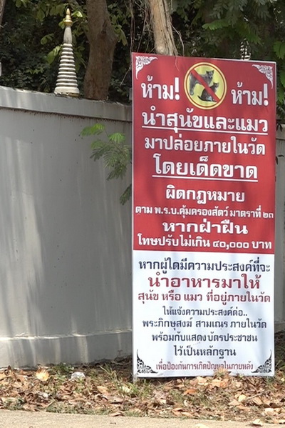 ผู้สื่อข่าวรายงานว่า ที่บริเวณด้านหน้าและภายในวัดป่ารัตนมงคล ต.ศิลา อ.เมืองขอนแก่น ได้ขึ้นป้ายคัตเอาต์ขนาดใหญ่พร้อมข้อความว่า ห้ามนำสุนัขและแมวมาปล่อยภายในวัดโดยเด็ดขาด ผิดกฎหมายตาม พ.ร.บ.คุ้มครองสัตว์ มาตรา 23 หากฝ่าฝืนจะมีโทษปรับไม่เกิน 40,000 บาท