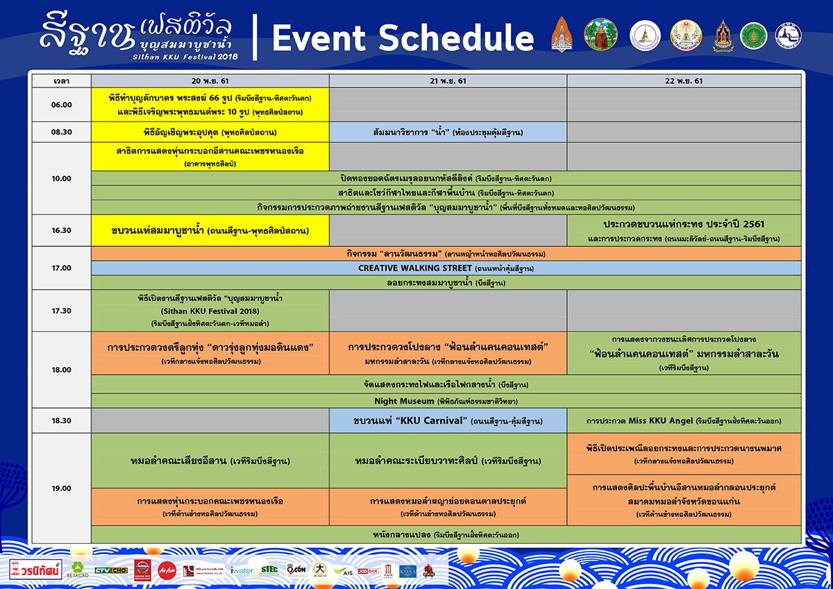 วันที่ 22 พ.ย. วันลอยกระทง มีประกวดขบวนแห่กระทง ประจำปี 2561 และการประกวดกระทง การแสดงจากวงชนะเลิศการประกวดโปงลาง การประกวด Miss KKU Angel พิธีเปิดประเพณีลอยกระทงและการประกวดนางนพมาศ การแสดงศิลปะพื้นบ้านอีสานหมอลำกลอนประยุกต์