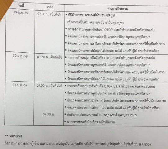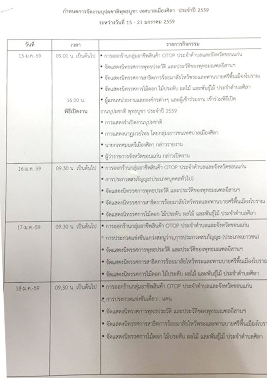 สำหรับพิธีเปิดงานจะมีขึ้นในวันที่ 15 ม.ค. 59 เวลา 16.30 น. ท่านจะได้รับชมการแสดงของเยาวชนเมืองศิลา และนักเรียนจากโรงเรียนขามแก่นนคร จ.ขอนแก่น กว่า 50 ชีวิต ซึ่งได้รับเกียรติจากผู้ว่าราชการจังหวัดขอนแก่น เป็นประธานเปิดงาน เช้าๆอากาศกำลังดีอย่าลืมนำข้าวสารอาหารแห้งร่วมทำบุญตักบาตรพระสงฆ์ 89 รูป เพื่อถวายเป็นพระราชกุศลแด่พระบาทสมเด็จพระเจ้าอยู่หัว ในวันที่ 19 ม.ค. 59 เริ่มเวลา 07.00 น.