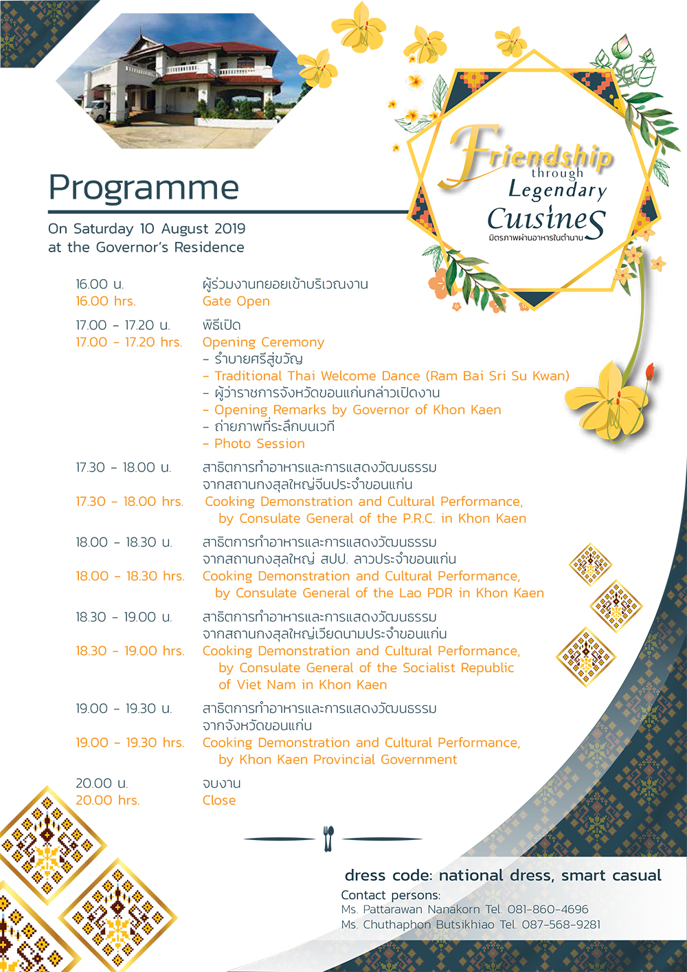 เพื่อเป็นการเชื่อมสัมพันธ์ระหว่างกัน ท่านผู้ว่าราชการจังหวัดขอนแก่น-ดร.สมศักดิ์ จังตระกุล จึงมีบัญชาให้จัดกิจกรรมเชื่อมไมตรี ผ่านเส้นทางตำนานอาหารของแต่ละชาติ ณ จวน ผู้ว่าราชการจังหวัดขอนแก่น เป็นมื้อค่ำ เมื่อวันที่ 10 สิงหาคม 2562 ที่ผ่านมา